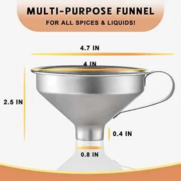 Show more Introducing the Aozita 18/8 Stainless Steel Spice Funnel – your ultimate kitchen ally designed to transform the way you cook. With a precise bottom diameter of 0.8 inches, this funnel fits seamlessly into most spice jars, eliminating the hassle of spills and waste associated with traditional funnels. Say farewell to messy countertops; this funnel features a seamless welded design that minimizes blockages, ensuring an effortless pour every time you refill your spices.