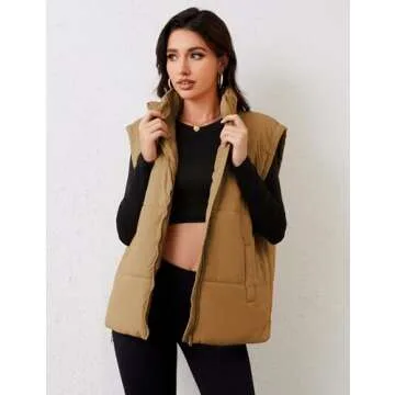 APAFES Women Winter Oversized Puffer Vest Lightweight Stand Collar Flysleeve Insulated Padded Puffy Jackets Coat with Pockets(0871-LightBrown-M)