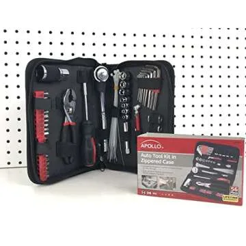 Introducing the Apollo Tools 56 Piece Compact SAE Auto Tool Set, your perfect companion for every roadside emergency. Designed with functionality in mind, this expertly crafted tool set comes neatly organized in a zippered case, allowing you to carry it effortlessly. Engineered for enthusiasts and everyday users alike, it features an array of tools ideal for car emergencies, motorcycle repairs, and various travel tool needs. The vibrant red case not only adds a splash of color but also ensures...