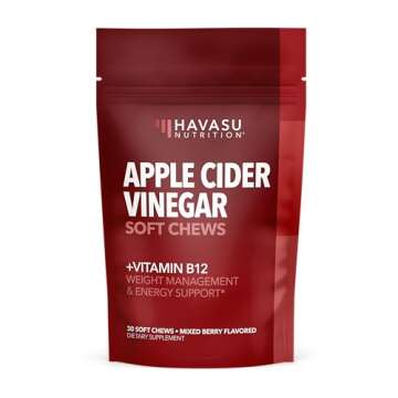 Show moreIntroducing the Apple Cider Vinegar Chews with Vitamin B12 and Folate, the delightful health supplement that transforms a traditional wellness staple into a convenient, tasty treat. Perfectly formulated for the busy individual, these chews allow you to enjoy the numerous health benefits of apple cider vinegar without the harsh taste. Encased in a delicious mixed berry flavor, each serving is designed to deliver powerful nutrition in an easy-to-take format. Whether you're commuting, working, or simply on-the-go, these chews support your health effortlessly.