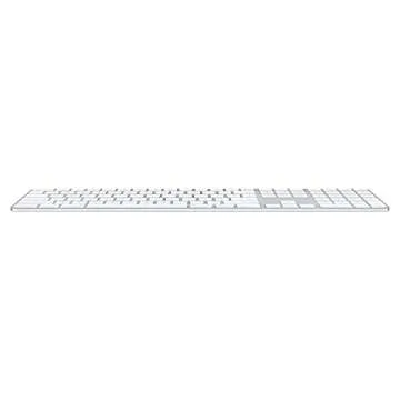 Show more Step into a new dimension of typing ease and efficiency with the Apple Magic Keyboard with Touch ID and Numeric Keypad. Designed for Mac computers equipped with Apple silicon, this keyboard not only enhances your workspace aesthetics with its sleek silver finish but also provides an exceptional typing experience. The extended layout is equipped with document navigation controls, making quick scrolling seamless, while the full-size arrow keys cater perfectly for gaming needs. Enjoy the freedom to type without tangles, thanks to its wireless functionality, allowing for a clutter-free setup. Plus, with an internal battery that lasts for about a month or more on a single charge, say goodbye to constant recharging and hello to productivity! Connect effortlessly to your Mac using the included woven USB-C to Lightning Cable for a tidy pairing and charging solution.