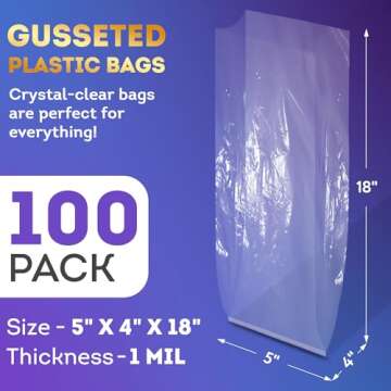 Show moreIntroducing the **APQ Clear Gusseted Poly Bags**, the ultimate solution for all your packaging needs! In a generous pack of 100, these transparent bags measure 5 x 4 x 18 inches and are designed specifically for showcasing your baked treats and goodies. Made from sturdy 1 Mil Polyethylene, these bags provide exceptional strength and flexibility, making them perfect for daily use, whether you're a small business owner or someone who loves to organize their kitchen. The clear design allows for complete visibility, ensuring that the quality and appeal of your items shine through.