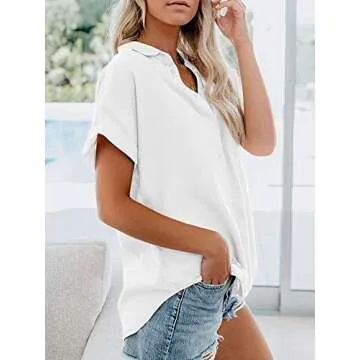 APRAW Womens Casual Short Sleeve Button Down Shirts Summer Cotton Plain Top Blouses with Pockets White