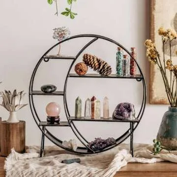Show moreIntroducing the Apresolar Moon Shelf for Crystals, a beautifully crafted decorative shelf that marries functionality with style. Designed with versatility in mind, this circular shelf is perfect for showcasing your treasured crystals, essential oils, or sentimental items. Whether you prefer it mounted on the wall to save space or displayed on a countertop, the Apresolar Moon Shelf adapts perfectly to your preferred aesthetic. Its retro black finish and intricate design make it a delightful addition to any room, transporting you into a realm of boho chic and artistic flair.