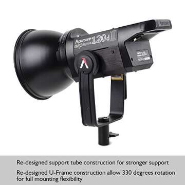 Show moreThe Aputure 120d Mark II Studio LED Video Light is your ultimate companion for stunning video and photography production. Designed with advanced technology, this 180W LED light delivers a bright and consistent color temperature of 5500K, perfect for simulating natural daylight. Its innovative Bowens mount allows for easy attachment of various light modifiers, enhancing your creative workflow. With exceptional color accuracy and a high CRI and TLCI rating of 95+, the 120d Mark II ensures that your videos and images will capture every detail beautifully. This benchmark studio light also features a sleek and integrated control interface that seamlessly blends with the lamp head, offering intuitive access to all its settings.