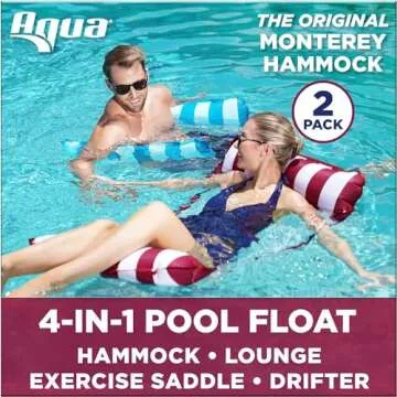 Show moreTransform your summer days into a luxurious retreat with the Aqua Monterey Hammock Pool Float. This versatile pool float, available in a Two Pack with one light blue and one burgundy/white stripe design, offers an exquisite blend of style and functionality. Designed for effortless relaxation, this float is perfect for anyone looking to lounge in the water without any hassle. Whether you’re taking a dip in the pool, floating on a lake, or enjoying a day at the beach, this hammock float is your ticket to supreme relaxation.