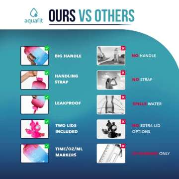 When compared to other large water bottles in the market, the AQUAFIT 1 Gallon Water Bottle stands out due to its combination of features. While many water jugs offer capacity and simplicity, AQUAFIT sets itself apart with its motivational time markers and quotes that inspire users throughout the day. Unlike other bottles, it includes both straw and chug lid options, catering to different drinking preferences. Many competitors lack user-friendly design elements like the wide mouth and sturdy handle, which enhance the overall drinking experience.