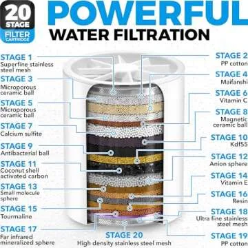 - 20-Stage Filtration: Removes a variety of contaminants including chlorine and heavy metals.