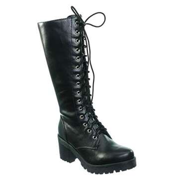 Show moreIntroducing the Aquapillar Block Heel Combat Boots—a stylish fusion of edgy and practical! Designed for the modern woman, these knee-high beauties feature a chunky block heel that elevates your look while providing a stable base for all-day comfort. Crafted from smooth faux leather, they showcase a military-inspired lace-up closure with a convenient side zipper for easy wear. Their sporty threaded lug sole not only offers a unique design but ensures optimum grip, making these boots a reliable choice for any occasion.