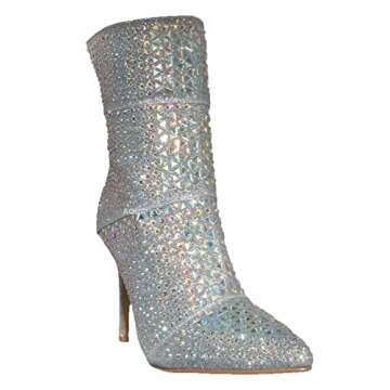 Show moreStep into style and elegance with the Aquapillar Rhinestone Studded Stiletto Bootie, a stunning addition to any fashionable woman’s wardrobe. These ankle-height stiletto booties are designed to ensure you make a memorable entrance at any formal occasion. Crafted with superior attention to detail, the upper features a dazzling sectional rhinestone crystal embellishment that catches the light beautifully, giving you a glamorous flair. Choose from chic color options including glamorous silver with glitter fabric, sophisticated black faux suede, and other stylish hues such as gold and blue. With a sleek high heel and pointed closed toe, these booties elevate your style while providing a comfortable fit for all-day wear.