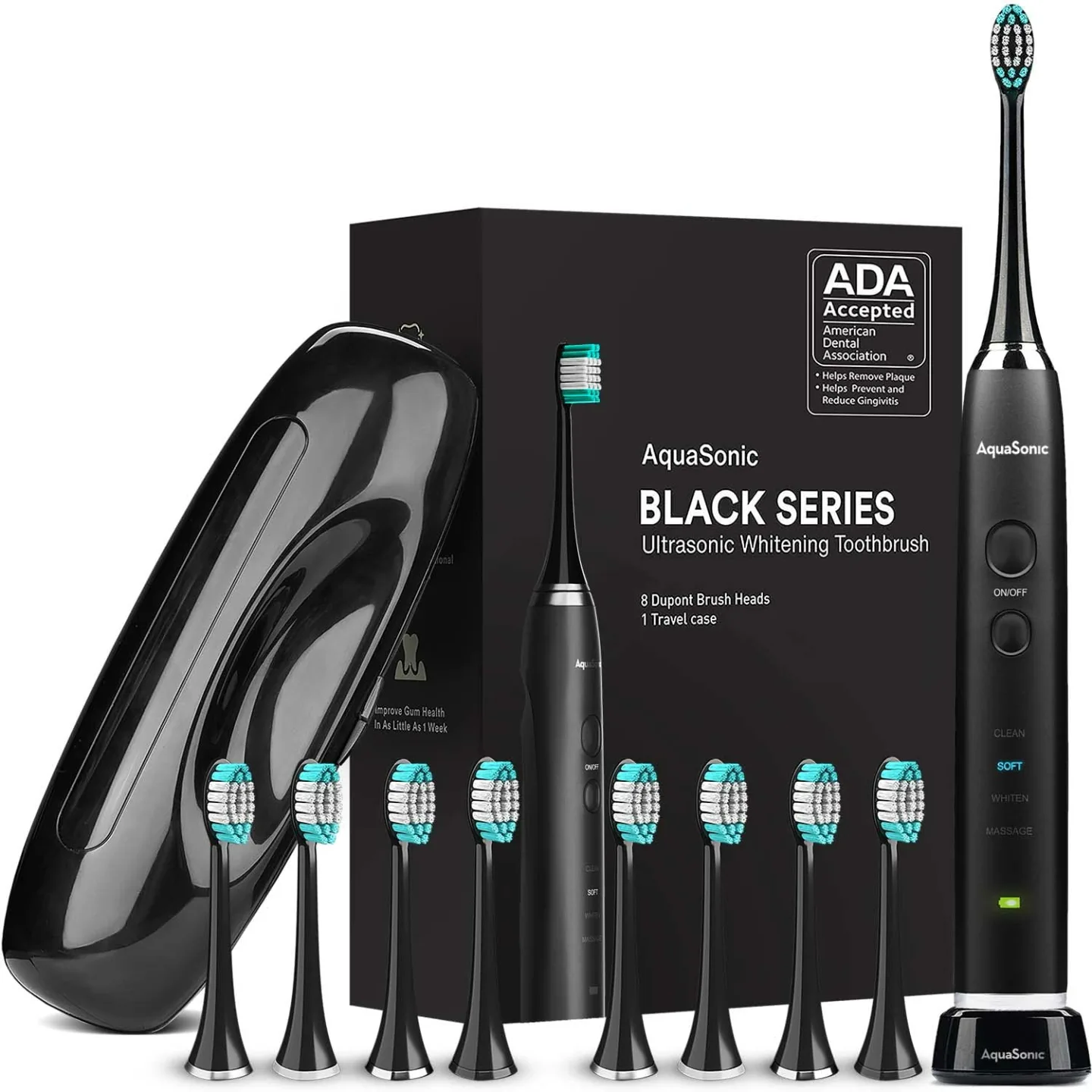 Show moreAmazon.com: AquaSonic Black Series Ultra Whitening Toothbrush – ADA Accepted Electric Toothbrush - 8 Brush Heads & Travel Case - Ultra Sonic Motor & Wireless Charging - 4 Modes w Smart Timer - Sonic Electric : Health & Household 40,000 VPM Smart Toothbrush – Beauty, brains and power. The Black Series is a world class modern electric toothbrush packed with the most up to date technology. It features an ultra-powerful and industry leading motor producing 40,000 vibrations per minute , lithium-ion battery, ultra-fast wireless charging, 4 mode operation, smart vibration timers, 8 DuPont engineered brush heads and bristles, and a custom travel case; all with a sleek ultra-slim, lightweight and IPX7 rated waterproof design. Accepted by the American Dental Association (ADA) Council on Scientific Affairs – We put our money where your mouth is. Investing in premium oral care technologies has earned the Black Series the prestigious ADA seal of approval. It has shown efficacy in removing plaque and helping to prevent and reduce gingivitis. Black Series goes beyond just cleaning teeth – it provides complete oral care with unique modes that include one for whitening and polishing teeth and one for improving gum health. 8 DuPont Brush Heads & Travel Case Included - Every Black Series toothbrush comes with 8 brush heads engineered by world famous DuPont; a world leader in quality & materials science. Each brush head lasts 4 months so 8 will last for over 2.5 years. Also included is a convenient custom hard shell travel case made of BPA Free plastic with space for two brush heads. AquaSonic can last 4 full weeks (2 min/2x a day) on a full charge so it's perfect for on the go travel with the included travel case