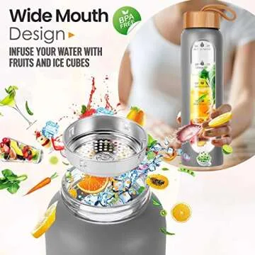 Show more Introducing the Aqulea Glass Water Bottle 32 Oz—your ultimate hydration partner designed to transform your daily water intake routine. Crafted with premium borosilicate glass, this stylish water bottle is not only durable and aesthetic but also completely safe for your family. Its BPA-free, BPS-free, PVC-free, lead-free, and cadmium-free design ensures that every sip is pure and refreshing. The 32-ounce capacity, accompanied by time markers and inspiring quotes, serves to keep you motivated throughout the day to drink more water, making hydration an integral part of your health journey.