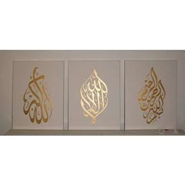 Arabic Calligraphy Islamic Handmade Pictures Wall Art Oil Paintings on Canvas 3pcs for Living Room Home Decorations Wooden Framed (Beige Gold)