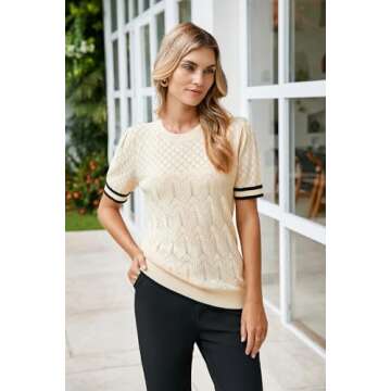 Show moreIntroducing the Arach&Cloz 2025 Women’s Summer Short Sleeve Sweater - your perfect companion for the warmer days ahead! Crafted from an exquisite Acrylic-Cotton Blend Fabric, comprising 45% cotton, this stylish top is designed to be breathable, sweat-absorbent, and winkle-resistant, ensuring comfort and elegance all day long. The unique delicate crochet details, punctuated by small crochet holes that allow airflow without revealing too much, are complemented by graceful contrast color striped cuffs, making this piece a standout in any casual or dressy setting.