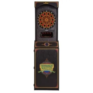 The package includes the electronic dartboard, a stylish cabinet to house the board, and 6 soft-tip darts.