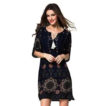 Show moreIntroducing the ARANEE Women Bohemian Neck Tie Vintage Printed Ethnic Style Shift Dress, a stunning addition to any summer wardrobe! Crafted from 100% premium rayon, this dress offers a light, airy feel that is both soft and comfortable against the skin. The breathtaking vintage floral print is designed to pop with color, ensuring you stand out whether you're attending a beach party, enjoying a day at the office, or just relaxing on vacation. With its versatile style, this dress can easily transition from a chic casual look into evening wear with a few simple accessories.