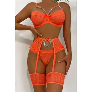 Aranmei Women’s Sexy Eyelash Fishnet Lingerie Set Chain Babydoll Underwire Bra and Panty Sets with Garter Belt 4 Pieces(Orange Small)