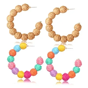 ARATLENCH Rattan Woven Dangling Earrings Handmade Straw Dangle Drop Earrings Boho Summer Beach Statement Circle Ball Hoop Earrings for Women (colorful brown rattan hoop earrings)