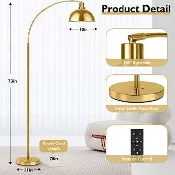 Arc Floor Lamps for Living Room, Modern Tall Standing Lamp Remote Control,Stepless Dimmable Gold Floor Lamp with Hanging Dome Shade, Over Couch Arched Reading Lamp for Bedroom, Office (Bulb Included)