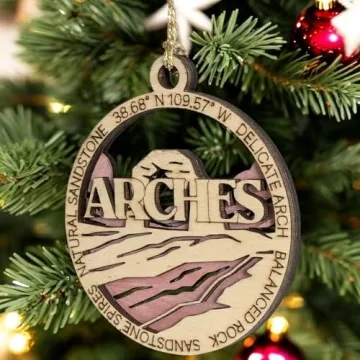 Show more Bring the breathtaking beauty of Arches National Park into your home with our exquisite Arches National Park Christmas Ornament. This charming ornament is handcrafted from high-quality, natural wood and features a unique two-layer design. The top layer showcases the park's iconic arch scenes beautifully printed and cut, while the back layer is crafted from sturdy wood, creating a stunning visual depth that catches the eye. Measuring approximately 3 inches in diameter, it's the perfect size to hang on your holiday tree or display year-round as a cherished reminder of your unforgettable visit to Utah. Celebrate nature and artistry with an ornament that centralizes warmth and the holiday spirit.