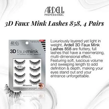 Show more If you're searching for a way to elevate your makeup game, look no further than Ardell Faux Mink 858 Multi-Dimensional Falsies. These luxurious lashes offer a stunning transformation to your everyday look. With their multi-layered design, you can achieve remarkable texture and fullness that flat, traditional lashes simply can't offer. The staggered fiber lengths not only enhance your natural lashes but also make your eyes pop with gorgeous depth. Why settle for anything less?