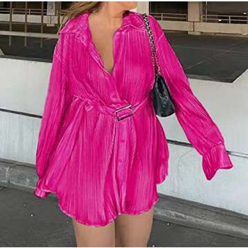 Argeousgor Women Long Sleeve V Neck Short Dresses Button Down Mini Blouse Dress Solid Elegant Shirts Dress Party Clubwear
