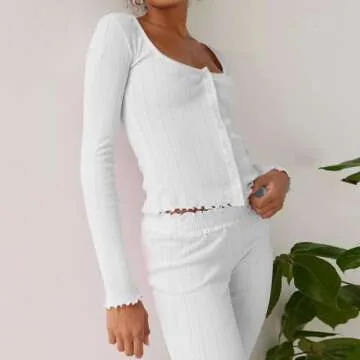 Argeousgor Women Y2k 2 Piece Pajamas Sets Floral Heart Long Sleeve Button Up Shirt Tops Pants Pjs Loungewear Sleepwear s A White