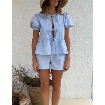 Show more Introducing the Argeousgor Women Y2k 2 Piece Tie Front Shorts Set, a chic and stylish pairing of a puff short sleeve peplum shirt with matching shorts. Crafted from a comfortable blend of 35% cotton and 65% polyester, this set is designed for versatility and ease, making it the perfect addition to your wardrobe. Whether you’re lounging at home, enjoying a summer beach day, or heading out for a casual evening, this pajama set seamlessly blends comfort with on-trend fashion. The trendy plaid design adds a fashionable flair, ensuring you look your best at all times. Experience a soft, breathable fabric that feels gentle against your skin and allows for easy movement, making each day a little more luxurious.