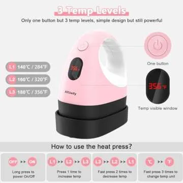 ARJudy Mini Heat Press Machine, Mini Heat Transfer Iron, 3 Settings Levels & Visible Temp, Portable Press Easy for Crafts, T-Shirt, Hats, Shoes, Bags, Cap and Small Vinyl Projects (Pink)