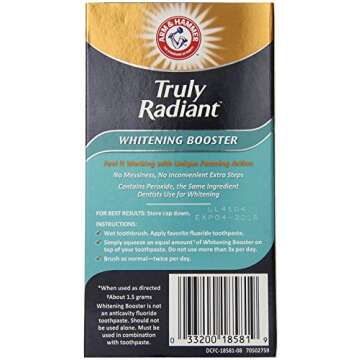 Show moreTransform your smile effortlessly with the Arm & Hammer Whitening Booster, an innovative teeth whitening solution designed to make achieving a brighter, whiter smile easier and faster than ever before. This 2.5 oz tube contains a potent formula that boasts a **3X whitening agent concentration** compared to leading whitening strips. With this easy-to-use booster, achieving a dazzling set of pearly whites is just a brush away. No need for complicated procedures; simply apply over your regular toothpaste and brush as you normally would. Watch as stains lift and teeth brighten in mere moments.