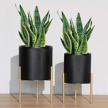 Show moreIntroduce a touch of elegance and style to your home or office with the **ARNIS Modern Planter Pots**. This exquisite set includes two beautifully crafted round planter pots, featuring a sophisticated black matte finish complemented by a chic gold accent. Designed for those who appreciate both aesthetics and functionality, these large decorative metal pots are perfect for nurturing a variety of plants, including the parlor palm, peace lily, aloe vera, and more. Elevate your space with lush greenery while adding a vital element of sophistication.