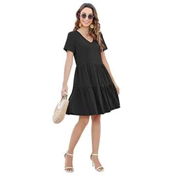 Arolina Women's Casual Swing Shift Dress Summer V Neck Short Sleeve Babydoll Ruffle Dress Tunic Dress (Black,M)
