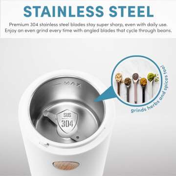 Show more Introducing the Aroma Electric Coffee Grinder, a versatile and compact kitchen essential that elevates your coffee and spice experience. This powerful grinder boasts a potent 150W motor and allows you to grind coffee beans, dried herbs, and various spices in mere seconds. Designed with premium 304 stainless steel blades, this grinder ensures sharpness and durability, providing you with an even grind on every use. The angled blade design further enhances grinding efficiency, making it a must-have for both coffee aficionados and culinary enthusiasts alike.