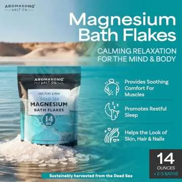 Show more Introducing the Aromasong Magnesium Flakes from The Dead Sea, a premium mineral treatment that delivers the extraordinary therapeutic benefits of magnesium for both mind and body. Each 14 oz resealable pack is filled with pure magnesium chloride flakes, directly sourced from the mineral-rich Dead Sea. These therapeutic bath salts are meticulously formulated to help you unwind, relax, and rejuvenate after a long day, making them an essential addition to your self-care routine.