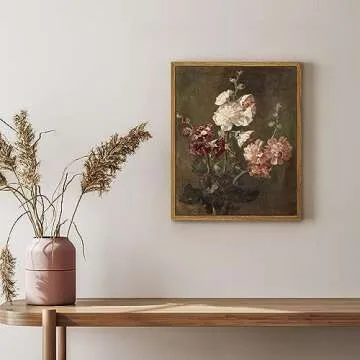 ARPEOTCY Framed Vintage Wall Art, Moody Floral Hollyhocks Bathroom Vintage Decor, Canvas Prints, French Country Farmhouse Decor, Home Dark Academia Wall Art, 9x11 Inch