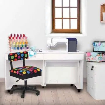 Constructed with *heavy-duty casters*, this chair rolls smoothly on most floors without leaving any marks or scratches, ensuring that your workspace remains pristine. The durable upholstery fabric is available in 11 vibrant patterns, which can effortlessly match any sewing or crafting space, adding a splash of personality to your environment.