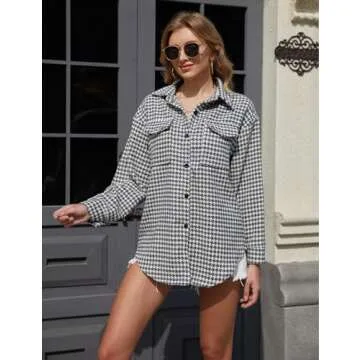 Arssm Plaid Shacket Jacket Women Long Sleeve Oversized Button Down Shirt Houndstooth Flannel Casual Tops (Black-M)