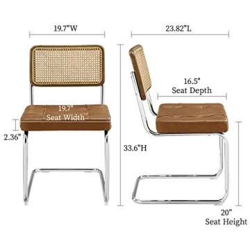 Show moreIntroducing the Art Leon Rattan Dining Chairs—where contemporary design meets classic elegance. This exquisite set of two chairs is not only designed to enhance your dining area but also provide ultimate comfort and support. Featuring a chic mid-century modern aesthetic, these chairs blend seamlessly into any décor, thanks to their sophisticated combination of genuine leather and hand-woven rattan.