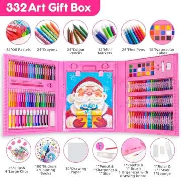 Show more This Art Craft Kit for Kids is an ultimate creative companion designed to inspire and nurture the budding artist in any child. With a whopping 332 pieces included, this comprehensive art supplies set has everything your young artist needs to explore a world of color and imagination. The kit combines a variety of painting and sketching accessories that cater to children aged 5 to 12, making it perfect for both beginners and more experienced little creators. The thoughtfully organized art set contains 12 Markers, 24 Colored Pencils, 24 Crayons, 48 Oil Pastels, 18 Watercolor Cakes, and much more! To enhance the overall artistic experience, we’ve included 4 coloring books, stickers, and drawing paper as added bonuses!
