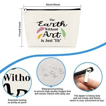 Show more Introducing the ultimate Art Teacher Gift Makeup Bag, designed specifically for the passionate artist or art lover in your life! With the delightful quote, "The Earth Without Art Is Just 'Eh'" printed proudly on its surface, this bag is not just a functional cosmetic case but a statement of creativity and inspiration. Measuring a perfect 10 x 7 inches (25 x 17 cm), this lightweight and portable bag can easily fit into any handbag, making it your go-to companion for organization while showcasing your artistic flair. Whether it's for daily use, a class, or a casual outing, this bag will keep you stylish and organized.