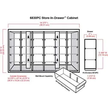 Show more The ArtBin Store-In Drawer Cabinet is designed to transform your craft storage experience, offering a sleek and functional solution for keeping various small supplies neatly organized. With an emphasis on ease of access and space efficiency, this cabinet features 30 clear plastic drawers perfect for storing beads, buttons, threads, small tools, and more. The drawers are designed for quick identification, saving you time and frustration as you search for what you need. Each drawer measures a compact size of 1-1/2 by 2-1/4 by 5-1/2 inches, making them ideal for small items.