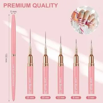 Show more Transform your nail art experience with this exceptional set of 5 Metal Nail Liner Brushes. Engineered with precision, this collection includes various sizes—5, 8, 12, 20, and 25mm—allowing you to execute intricate designs effortlessly. Whether you’re a professional nail technician or simply an enthusiast, these brushes are your perfect companions for creating stunning nail patterns in no time.