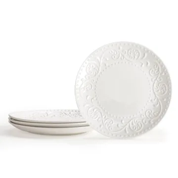Artena Embossed Ceramic Salad Plates - Set of 4, 8.25 Inch White Dinner Plates for All Occasions
