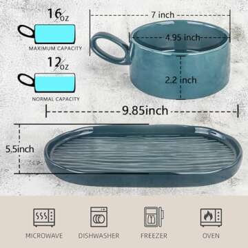 Artena Solid Soup and Sandwich Plate Combo, Teal Blue Ceramic Bowls and Plates Set