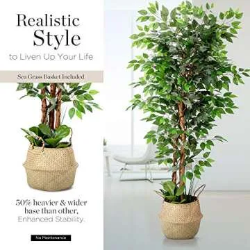 Artificial Ficus Tree, 72 Inches Tall - Fake Floor Plant for Modern Home Decor - Living Room, Bedroom, Balcony - Faux Potted Trees for Indoor or Outdoor - Includes Free Bonus Seagrass Belly Basket