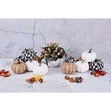 Show more Transform your fall decorations with these exquisite Artificial Fall Harvest Pumpkins that come in a delightful package of 12 pieces. Perfectly designed in assorted sizes and colors, this collection includes 4 plaid white-black pumpkins, 4 classic white pumpkins, and 4 charming burlap pumpkins. Each pumpkin measures around 3.35 inches in diameter and 2.75 inches in height, making them suitable for various decorative needs. Whether you're looking to spruce up your tabletop, create a stunning seasonal bowl display, or craft an enchanting Thanksgiving dinner centerpiece, these pumpkins are ideal.