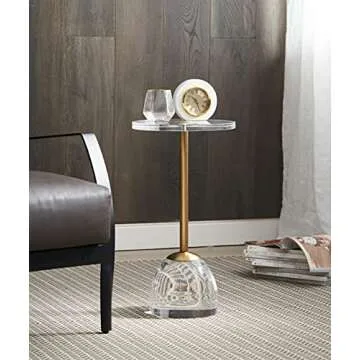 Show more Transform your living space with the exquisite Artmaze Clear Acrylic End Table, where modern design meets functionality. This stunning piece is crafted from top-quality clear acrylic and accented with brushed brass metal, seamlessly fitting into various home or office decors. With elegant curves and a sleek silhouette, this table stands at a perfect height of 21.3 inches and boasts a compact width and depth of just 12x12 inches, making it an ideal addition to both spacious and smaller areas. Whether you’re enjoying a calming tea, diving into a good book, or showcasing your favorite decor pieces, this table invites relaxation and sophistication.