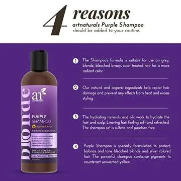 Artnaturals Purple Shampoo is your ultimate hair care solution specifically crafted for those with blonde, silver, or color-treated hair. This 12oz bottle contains a unique, sulfate-free formula that is exceptional in balancing, protecting, and enhancing color vibrancy. With its potent pigments designed to combat unwanted yellow tones, you can achieve a more radiant hair color while prolonging its vibrancy and shine. Whether you're flaunting blonde highlights, silver locks, or bleached brassy...