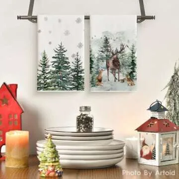 Artoid Mode Elk Trees Snow Hello Winter Kitchen Towels Dish Towels, 18x26 Inch Seasonal Christmas Decoration Hand Towels Set of 2