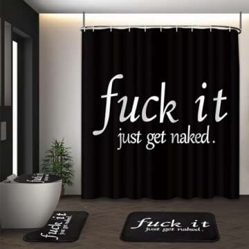 Show more Transform your bathroom into a vibrant oasis with the exquisite ArtSocket 4PC Funny Get Naked Shower Curtain Set. This stunning set combines functionality with style, featuring a beautifully designed shower curtain crafted from high-quality, waterproof polyester fabric. This ensures that water glides off effortlessly, keeping your bathroom space dry and elegantly chic. Accompanying the curtain are a luxurious bath mat, a U-shaped mat, and a toilet lid cover, all made from soft flannel material that brings a plush touch to your feet. With its perfect blend of durability and resistance to fading, every component of this set is designed to elevate your bathroom's aesthetic.